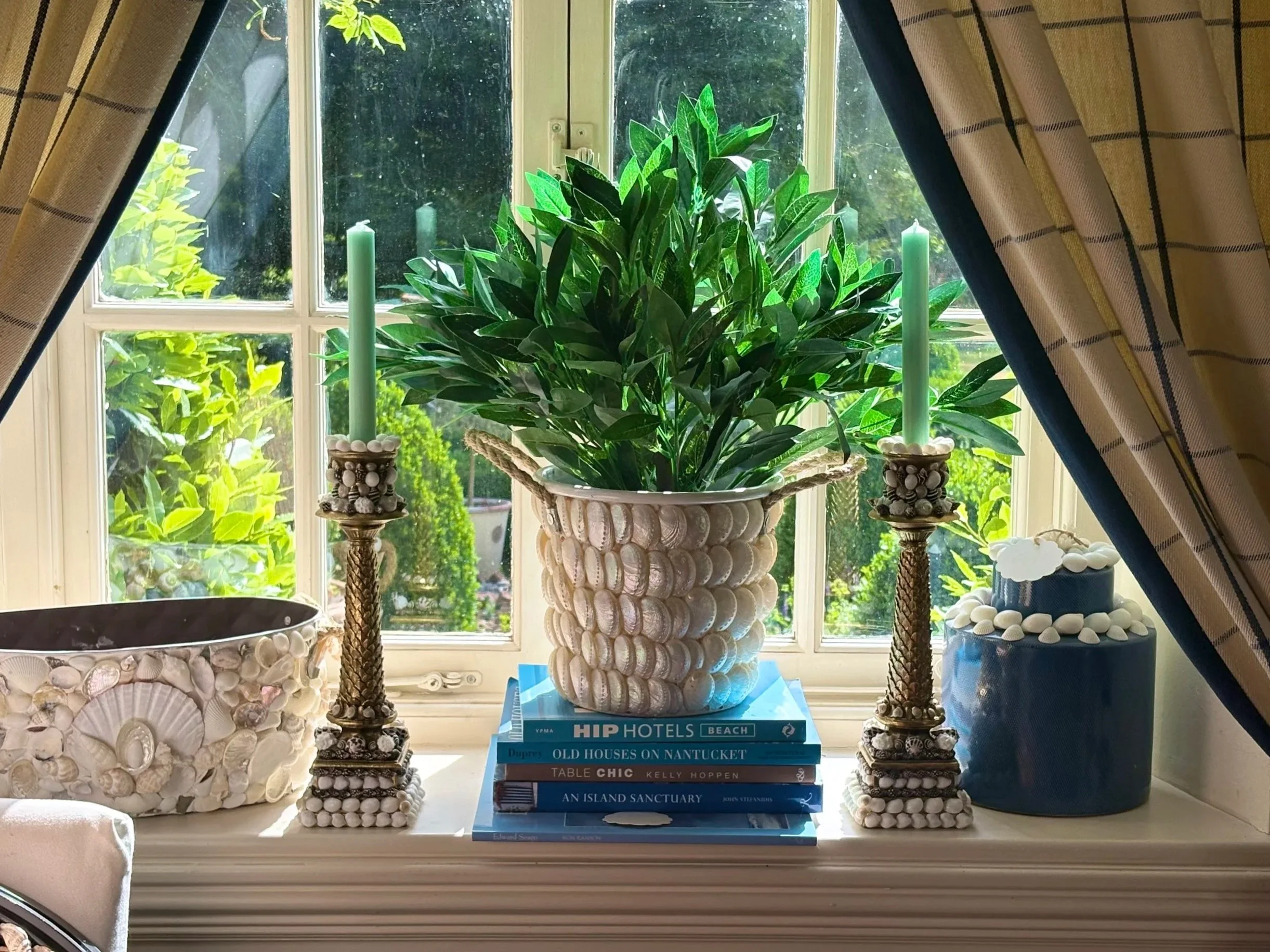 Tall feather candlesticks in deep french blue decorated with white ridged cockle shells and pearl turbans shells, white coral, pinky purple sea urchins.